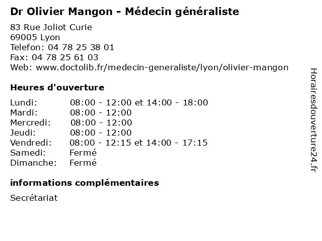 1 Dr Emmanuelle Douare-Mangon - Médecin généraliste (Distance: 0,00 km) 83 Rue Joliot Curie, 69005 Lyon docteur, douare, dr, emmanuelle, generaliste, généraliste, mangon, medical, médecin, soin 3 Dr Olivier Peeters - Médecin généraliste (Distance: 1,70 km) 39 Chemin de la Vernique, 69130 Écully docteur, dr, generaliste, généraliste, medical, médecin, olivier, peeters, soin 4 Dr Olivier Baillat - Angiologue (Distance: 1,70 km) 39 Chemin de la Vernique, 69130 Écully angiologue, baillat, cabinet, dr, medical, olivier, secretariat, traitements, vasculaires 5 Dr Olivier Baillat - Angiologue (Distance: 1,88 km) 39 Chemin de la Vernique, 69130 Écully angiologue, baillat, consultation, docteur, dr, med, médecin, médecine, olivier, secrétariat, traitement 6 Dr Olivier Robin - Chirurgien-dentiste (Distance: 2,21 km) 6-8 place Depéret, 69007 Lyon chirurgien, consultation, dentiste, docteur, dr, med, médecin, médecine, olivier, robin, traitement |