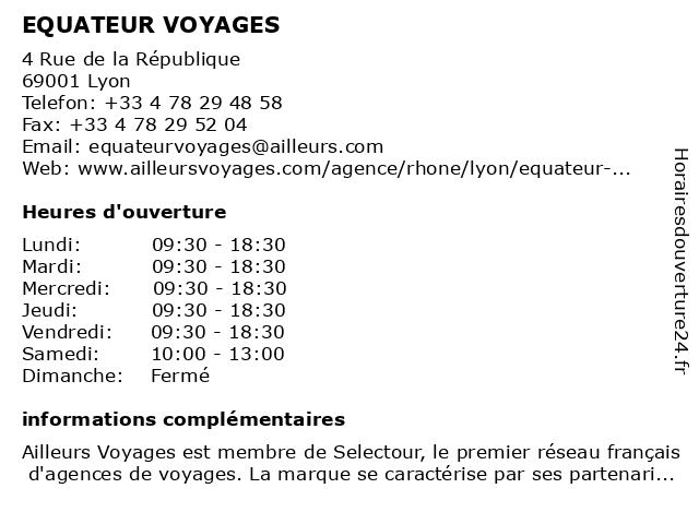 1 Selectour - Equateur Marietton (Distance: 0,01 km) 4 rue de la République, 69001 Lyon agence, billets, equateur, loisirs, marietton, selectour, voyages 2 Berthelet Voyages - Selectour (Distance: 0,17 km) 17 rue Paul Chenavard, 69001 Lyon agence, berthelet, selectour, voyages 3 Look Voyages (Distance: 0,21 km) 5 Rue Gentil, 69002 Lyon agence, billet d'avion et hôtel pour votre club, look, séjour, voyage, voyages 4 Asia, agence de voyages (Distance: 0,31 km) 46 Rue du Président Edouard Herriot, 69002 Lyon agence, asia, de, office, tours, travel agency, voyages 5 Jetset Voyages / Marietton Ailleurs Voyages (Distance: 0,48 km) 51 Rue Président Herriot, 69002 Lyon agence, ailleurs, billet d'avion et hôtel pour votre club, jetset, marietton, séjour, voyages 6 Jetset Voyages / Djuringa (Distance: 0,53 km) 3 Quai Jules Courmont, 69002 Lyon agence, billet d'avion et hôtel pour votre club, djuringa, jetset, séjour, voyages |