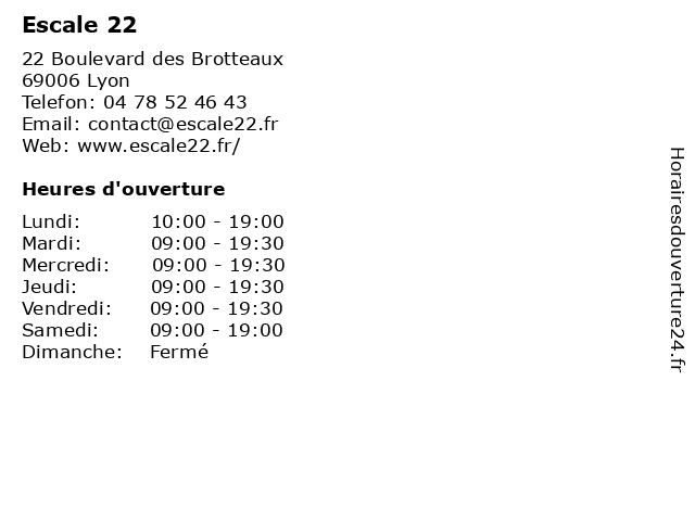 1 Corner Signature Boutique 22 (Distance: 1,72 km) 22 Avenue Henri Barbusse, 69100 Villeurbanne 22, boutique, business, clothing, corner, shopping, signature, stores 2 22 Rue de la République (Distance: 1,73 km) 22 Rue De La République, 69002 Lyon 22, agence spécialisée dans l'immobilier commercial, conciergerie, conseil en construction, de, expertise immobilière, la, notaire, procureur d’appel, rue, république, service d'investissement, station-service de remorquage 4 Crèche Familiale L'Escale (Distance: 2,94 km) 105 Avenue Alexander Fleming, 69300 Caluire-et-Cuire caregivers houses, child care, crèche, familiale, family home, home care, kindergartens, l'escale, micro-nurseries, parental home 6 Restaurant L'Escale (Distance: 10,46 km) 3 Route de Lyon, 69740 Genas bar, brasserie, café, escale, l'escale, restaurant, restaurants |