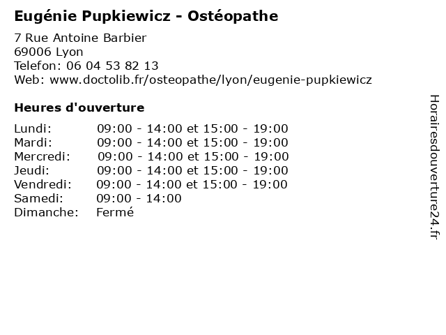1 Eugénie Pupkiewicz - Ostéopathe (Distance: 0,86 km) 7 rue Barrier, 69006 Lyon care, clinic, dentist, eugénie, france, gynécologue, health, kinesitherapeute, ophtalmologiste, orl, ostéopathe, psychologue, pupkiewicz, service 2 Maître Eugénie Leynaud - Avocate (Distance: 1,55 km) 40 rue de Bonnel, 69003 Lyon avocate, avocats, cabinet, conseils, contentieux, eugénie, juridique, justice, leynaud, litiges, maître, services 3 Eugénie Niboyet (Distance: 2,93 km) 42 Rue I. et F. Joliot Curie, 69100 Villeurbanne caregivers houses, child care, eugénie, family home, home care, kindergartens, micro-nurseries, niboyet, parental home 4 Eugénie Gauthier - Ostéopathe (Distance: 3,07 km) 26 Cours Docteur Long, 69003 Lyon eugénie, gauthier, ostéo, ostéopathe, ostéopathes, soins 5 Eugénie Di Leone (Distance: 4,28 km) 35 Rue du Maréchal de Lattre de Tassigny, 69009 Lyon di, eugénie, leone 6 Dr Eugénie Deparois - Chirurgien-dentiste (Distance: 4,70 km) 62 Rue Ludovic Arrachart, 69008 Lyon chirurgien, dent, dentiste, deparois, docteur, dr, eugénie, soins |
