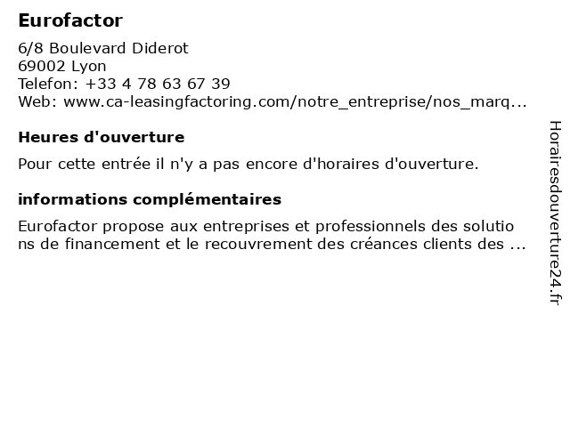 1 Eurofactor (Distance: 4,79 km)1 Chemin du Truchis de Lays, 69410 Champagne-au-Mont-d'Or eurofactor