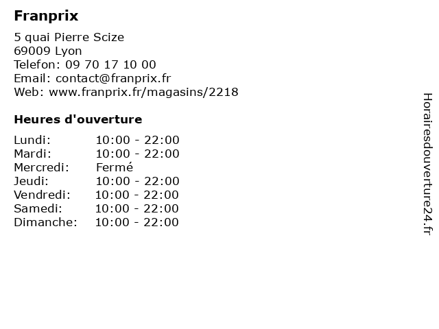 1 Franprix (Distance: 1,28 km) 32 Rue de Bourgogne, 69009 Lyon alimentaire, franprix, magasin alimentaire, magasin de proximité 2 Franprix (Distance: 1,43 km) 3 Place Tobie Robatel, 69001 Lyon alimentaire, franprix, magasin alimentaire, magasin de proximité 3 Franprix (Distance: 1,64 km) 6 Rue de Cuire, 69004 Lyon alimentaire, alimentation, courses, franprix, supermarché, supérette, épicerie 4 Franprix (Distance: 1,92 km) 26 Rue Sala, 69002 Lyon bibi, carte de fidelite, courses, franprix, magasin, produits frais, programme de fidélité, supermarché, épicerie 5 Franprix (Distance: 2,60 km) 49 Rue Cuvier, 69006 Lyon bibi, carte de fidélité, courses, franprix, magasin, produits frais, programme de fidélité, supermarché, épicerie 6 Franprix (Distance: 2,74 km) 16 rue Félix Jacquier, 69006 Lyon alimentaire, alimentation, courses, franprix, supermarché, supérette, épicerie |