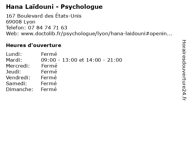 1 Maître Hana Hassoumi - Avocate (Distance: 4,41 km) 174 rue de Créqui, 69006 Lyon avocat, avocate, droit, hana, hassoumi, maître, négociation 2 Biyo Hana (Distance: 43,58 km) 5 place de l'Eglise, 69220 Belleville beauté, biyo, cosmetique, hana, institut, massage, relaxation 3 Amélie Nahdi - Psychologue (Distance: 0,01 km) 167 Boulevard des États-Unis, 69008 Lyon amélie, nahdi, psy, psychiatre, psychologue, sante, soins 4 Vanesa Talovic - Psychologue (Distance: 0,01 km) 167 Boulevard des États-Unis, 69008 Lyon psy, psychiatre, psychologue, sante, soins, talovic, vanesa 5 Geoffrey Rignol - Psychologue (Distance: 0,01 km) 167 Boulevard des États-Unis, 69008 Lyon geoffrey, psy, psychiatre, psychologue, rignol, sante, soins 6 Jean-Sixte Lepitre - Psychologue (Distance: 0,01 km) 167 Boulevard des États-Unis, 69008 Lyon folie, jean, lepitre, psychiatre, psychiatrie, psychiatrique, psychologue, sixte |