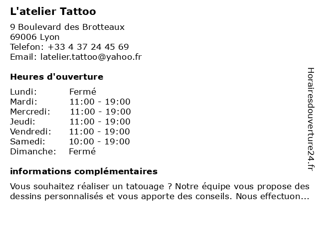1 Atelier L (Distance: 0,06 km) 15 Rue Professeur Weill, 69006 Lyon atelier, cours de maquillage, maquillage, mariage 2 Atelier Vitrail Le Cygne (Distance: 0,09 km) 23 Rue Professeur Weill, 69006 Lyon atelier, cygne, le, vitrail 3 MiniSkull Tattoo (Distance: 0,85 km) 111 rue des Charmettes, 69006 Lyon de, ink, miniskull, salon, shop, style, tatouage, tattoo 4 Pandaemonium Tattoo Shop (Distance: 0,96 km) 288 cours lafayette, 69003 Lyon boutiques, dessin, pandaemonium, piercing, shop, tatouage, tattoo 5 Tripp'Ink - Tattoo & Piercing (Distance: 1,06 km) 23 Rue Étienne Richerand, 69003 Lyon de, ink, piercing, salon, shop, style, tatouage, tattoo, tripp'ink 6 Synergik Tattoo (Distance: 1,06 km) 26 Rue Baraban, 69003 Lyon art shop, beauty, body ink, business, skin, synergik, tattoo  |