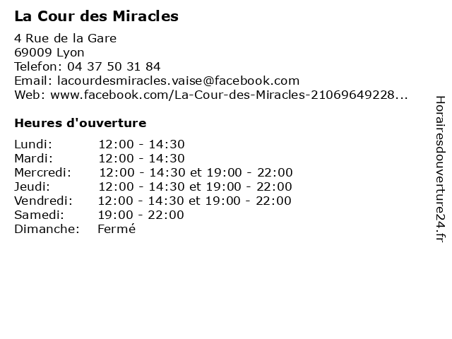 1 La Cour Des Miracles (Distance: 7,12 km) 20 Cours du Docteur Long, 69003 Lyon cour, des, hbmr, la, miracles, restaurants 3 Fenêtre sur Cour (Distance: 0,73 km) 11 Avenue Sidoine Apollinaire, 69009 Lyon banquet, bar, cour, fenêtre, menu, plats, restaurant, sur 4 Green Acres - Jardin Cour Et Dependances (Distance: 1,23 km) 33 Arloing, 69337 Lyon acres, agency, apartment, cour, dependances, et, green, jardin, real estate 5 Hotel Cour des Loges (Distance: 2,67 km) 6 Rue du Bœuf, 69005 Lyon bar, cour, des, hotel, loges, restaurant, service 6 La Cour Des Grands (Distance: 3,16 km) 60 Montée de Choulans, 69005 Lyon bars, clubs, cour, des, drinks, grands, la, lounges |