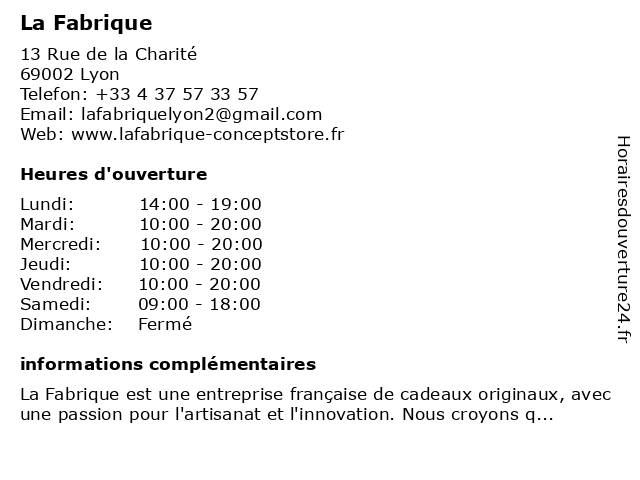 1 LA FABRIQUE A CLIENTS (Distance: 0,86 km) 57 Rue President Edouard Herriot, 69002 Lyon 2ème clients, fabrique, la 2 La Fabrique Givrée (Distance: 0,94 km) 66 rue Saint Jean, 69005 Lyon fabrique, givree, givrée, glaces, glacier, ii, la, restauration 3 Boulangerie La Fabrique de Justine (Distance: 1,08 km) 37 Avenue Jean Jaurès, 69007 Lyon biscuits, boulangerie, chocolats, de, fabrique, gâteaux, justine, la, pâtisserie 4 La Fabrique - Cookies (Distance: 2,03 km) 17 rue Docteur Bouchut, 69003 Lyon biscuits, boutique, chocolats, cookies, fabrique, gâteaux, la 5 Fabrique de l'Innovation - Université de Lyon (Distance: 2,28 km) 6 cours Albert Thomas, 69008 Lyon accompagnement, créativité, de, fabrique, innovation, l'innovation, lyon, prototypage, université 6 La Fabrique de Thé (Distance: 2,59 km) 5 rue d'Ivry, 69004 Lyon accessoires, cadeaux, de, fabrique, la, produits, thé |