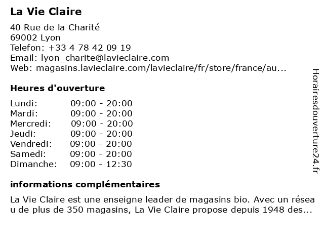 1 La Vie Claire (Distance: 0,91 km) 36 Rue de l'Université, 69007 Lyon alimentation bio, claire, la, magasins bio, produits bio, vie 2 La Vie Claire (Distance: 1,28 km) 123 Avenue Maréchal de Saxe, 69003 Lyon alimentation bio, claire, la, magasins bio, produits bio, vie 3 La Vie Claire (Distance: 1,43 km) 87 bis Cours Charlemagne, 69002 Lyon alimentation bio, claire, la, magasins bio, produits bio, vie 4 La Vie Claire (Distance: 1,57 km) 138 Grande Rue de la Guillotière, 69007 Lyon alimentation bio, claire, la, magasins bio, produits bio, vie 5 La Vie Claire (Distance: 1,80 km) 183 Rue André Philip, 69003 Lyon alimentation bio, claire, la, magasins bio, produits bio, vie 6 La Vie Claire (Distance: 2,55 km) 5 Rue Challemel-Lacour, 69007 Lyon alimentation bio, claire, la, magasins bio, produits bio, vie |