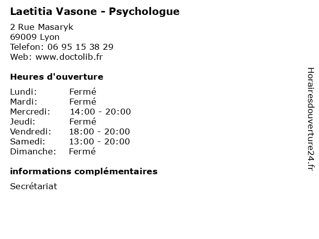 1 Laetitia Metzger - Hypnothérapeute (Distance: 1,43 km) 84 Rue des Docks, 69009 Lyon hypnose, hypnotherapeute, hypnothérapeute, laetitia, metzger, sante, soins 2 Laetitia Thomas - Pédicure-podologue (Distance: 2,00 km) 69 Rue Belfort, 69004 Lyon dr, laetitia, medical, podologue, pédicure, secrétariat, thomas 3 Dr Laetitia Vulliez - Gynécologue médical et obstétrique (Distance: 2,33 km) 39 Chemin de la Vernique, 69130 Écully consultation, docteur, dr, et, gynécologue, laetitia, med, médecin, médecine, médical, obstétrique, secrétariat, traitement, vulliez 4 Medecin Laetitia Sarassat (Médecin généraliste) (Distance: 2,73 km) 1 Rue du Commandant Charcot, 69005 Lyon docteur, généraliste, laetitia, medecin, médecin, sante, sarassat, services 5 Medecin Laetitia Sarassat - Horaires du Cabinet (Médecin généraliste) (Distance: 2,73 km) 1 Rue du Commandant Charcot, 69005 Lyon cabinet, docteur, du, généraliste, horaires, laetitia, medecin, médecin, sante, sarassat, services 6 Laetitia Lardet - Psychologue (Distance: 2,86 km) 26 Rue Vendôme, 69006 Lyon folie, laetitia, lardet, psychiatre, psychiatrie, psychiatrique, psychologue |