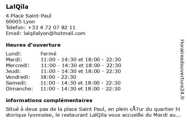 Situé à deux pas de la place Saint Paul, en plein cÅ?ur du quartier historique lyonnaise, le restaurant LalQila vous accueille du Mardi au Dimanche pour déguster des plats typiquement indiens. D...