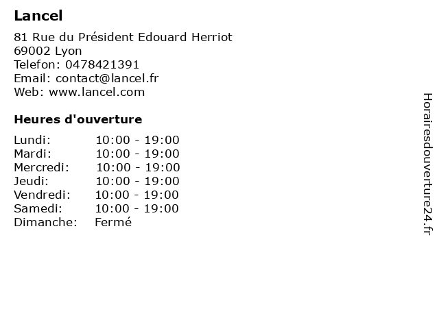 1 Lancel (Distance: 0,10 km) 42 Rue de la république, 69002 Lyon chaussures, femme, homme, lancel, maroquinerie, mode 2 Lancel (Distance: 1,64 km) . Boulevard Eugène Déruelle, 69003 Lyon chaussures, femme, homme, lancel, maroquinerie, mode 3 Lancel (Distance: 5,39 km) 209-221 Boulevard Pinel, 69008 Lyon chaussures, femme, homme, lancel, maroquinerie, mode 4 6 Timberland (Distance: 0,03 km) 5 Rue Childebert, 69002 Lyon accessoires, boutique, chaussures, mode, prêt à porter, timberland |