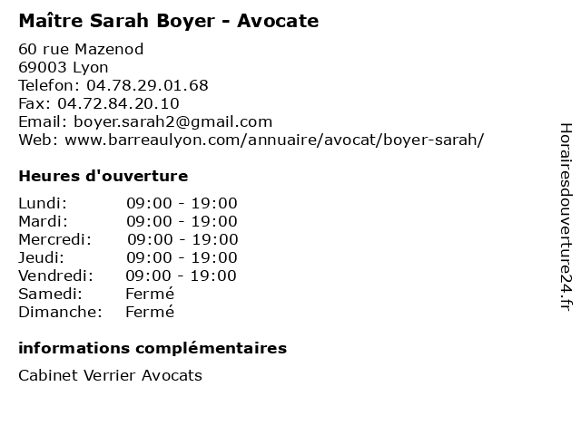 1 Dr Sarah Sarri - Chirurgien-dentiste (Distance: 0,21 km) 10 Rue de Sévigné, 69003 Lyon chirurgien, consultation, dentiste, docteur, dr, med, sarah, sarri, secrétariat 2 Maître Sarah Bakir - Avocate (Distance: 0,44 km) 14 rue Rabelais, 69003 Lyon avocate, avocats, bakir, cabinet, conseils, contentieux, juridique, justice, litiges, maître, sarah, services 3 Maître Vanessa Bonaccorsi-Boyer - Avocate (Distance: 0,47 km) 3 Rue de la Barre, 69002 Lyon agence, avocat, avocate, bonaccorsi, boutique, boyer, destinations, maître, tourisme, tours, vacances, vanessa, voyage 4 Maître Sarah Just - Avocate (Distance: 0,59 km) 40 Rue Voltaire, 69003 Lyon avocate, avocats, cabinet, conseils, contentieux, juridique, just, justice, litiges, maître, sarah, services 5 Maître Lucie Boyer - Avocate (Distance: 0,70 km) 8 Rue Vauban, 69006 Lyon avocat, avocate, boyer, justice, loi, lucie, maitre, maître 6 Maître Sarah Ulmann - Avocate (Distance: 0,86 km) 208 Rue Garibaldi, 69003 Lyon avocat, avocate, droit, maître, négociation, sarah, ulmann |