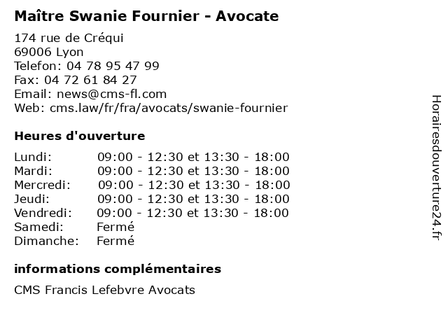 1 Maitre Véronique Fournier - Avocat (Distance: 0,31 km) 54 Cours Lafayette, 69003 Lyon avocat, avocats, bureaux, consultations, fournier, juridiques, juristes, maitre, veronique, véronique 2 Maître Jean-Jacques Fournier - Avocat (Distance: 0,88 km) 119 avenue Maréchal de Saxe, 69003 Lyon avocat, avocats, cabinet, conseils, contentieux, fournier, jacques, jean, juridique, justice, litiges, maître, services 3 Fournier Frères (Distance: 1,13 km) 34 Rue Tête d'Or, 69006 Lyon carrelage, fournier, frères, peinture, plâtrerie, revêtement 4 Dr Thomas Fournier - Néphrologue (Distance: 2,20 km) 46 Avenue Condorcet, 69100 Villeurbanne consultation, docteur, dr, fournier, med, médecin, médecine, néphrologue, thomas, traitement 5 Dr Emmanuelle Dreyer-Fournier - Médecin généraliste (Distance: 2,68 km) 122 Cours Tolstoï, 69100 Villeurbanne docteur, dr, dreyer, emmanuelle, fournier, generaliste, généraliste, medical, médecin, soin 6 Maître Pauline Fournier - Avocate (Distance: 2,77 km) 45 quai Charles de Gaulle, 69006 Lyon avocate, avocats, cabinet, conseils, contentieux, fournier, juridique, justice, litiges, maître, pauline, services |