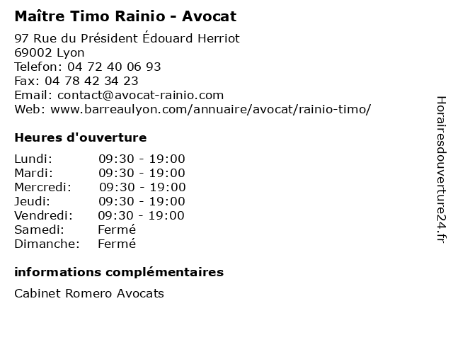 1 Maître Christian Romero - Avocat (Distance: 0,00 km) 97 Rue du Président Édouard Herriot, 69002 Lyon avocat, avocats, cabinet, christian, conseils, contentieux, juridique, justice, litiges, maître, romero, services 2 Maître Natacha Traparic - Avocate (Distance: 0,00 km) 97 Rue du Président Édouard Herriot, 69002 Lyon avocate, avocats, cabinet, conseils, contentieux, juridique, justice, litiges, maître, natacha, services, traparic 3 Maître Matthieu Baglan - Avocat (Distance: 0,08 km) 16 bis Rue Gasparin, 69002 Lyon avocat, baglan, justice, lois, maitre, matthieu, maître 4 Maître Beatrice Rocher - Avocat (Distance: 0,11 km) 13 Rue Émile Zola, 69002 Lyon avocat, beatrice, justice, lois, maitre, maître, rocher 5 Maître Vanessa Bonaccorsi-Boyer - Avocate (Distance: 0,15 km) 3 Rue de la Barre, 69002 Lyon agence, avocat, avocate, bonaccorsi, boutique, boyer, destinations, maître, tourisme, tours, vacances, vanessa, voyage 6 Maître Antoine Rousseau - Avocat (Distance: 0,24 km) 8 place bellecour, 69002 Lyon antoine, avocat, avocats, cabinet, conseils, contentieux, juridique, justice, litiges, maître, rousseau, services |