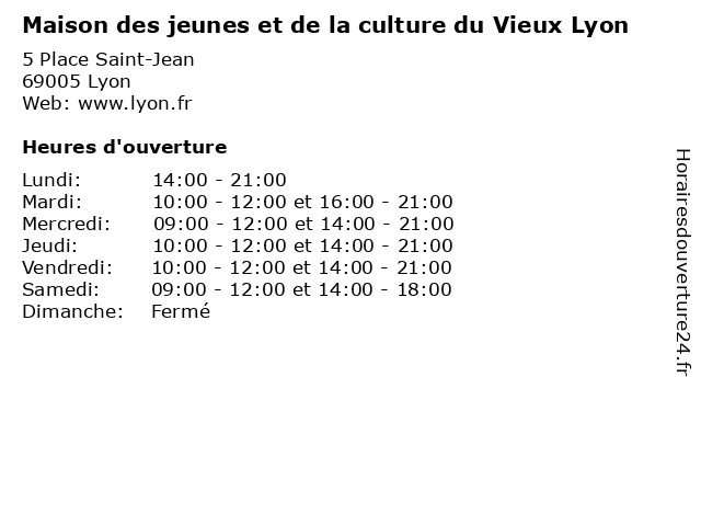 | Vendredi | 10:00-12:00 et 14:00-21:00 |