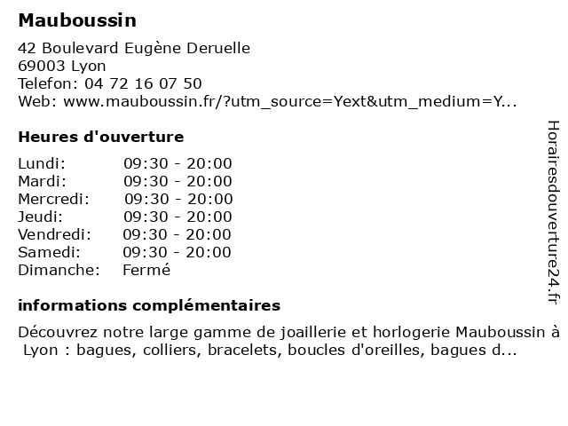 1 Mauboussin (Distance: 0,32 km) 17 Rue Du Docteur Bouchut, 69003 Lyon bijouterie, expertise en bijouterie, magasin de montres, mauboussin 2 Mauboussin (Distance: 1,81 km) 95 Rue Du Président Édouard Herriot, 69002 Lyon bijouterie, expertise en bijouterie, magasin de montres, mauboussin 3 Mauboussin (Distance: 12,74 km) 2 Chemin des Batterses, 01700 Beynost accessoires, bijoux, la mode, les parfums, mariage, mauboussin, rouages 4 Louis Pion (Distance: 0,01 km) 42 Boulevard Eugène Deruelle, 69003 Lyon bijouterie, bijoutier, horloger, louis, montres, or, pion 5 Histoire d'Or (Distance: 0,11 km) 17 Rue Dr Bouchut, 69003 Lyon bijoutier, création de bijoux, d'or, gravures sur bijoux, histoire, magasin de montres, négociant en or, réparation de bijoux, réparation de montres 6 Smizze (Distance: 0,12 km) 17 Rue du Dr Bouchut, 69003 Lyon bijoux, boutique, bracelets, montres, smizze |