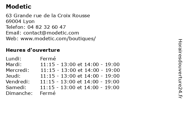 | Mardi | 11:15-13:00 et 14:00-19:00 |