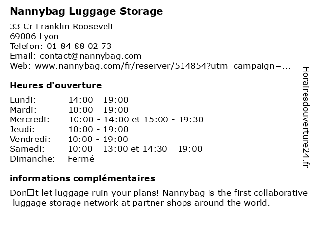 2 Nannybag Luggage Storage (Distance: 0,36 km) 7 Pl. Edgar Quinet, 69006 Lyon luggage, nannybag, storage 4 Nannybag Luggage Storage (Distance: 1,43 km) 11 Rue Aimé Collomb, 69003 Lyon luggage, nannybag, storage 5 Nannybag Luggage Storage (Distance: 1,64 km) 16 Quai Romain Rolland, 69005 Lyon luggage, nannybag, storage 6 Nannybag Luggage Storage (Distance: 1,76 km) 25bis Quai Romain Rolland, 69005 Lyon luggage, nannybag, storage |