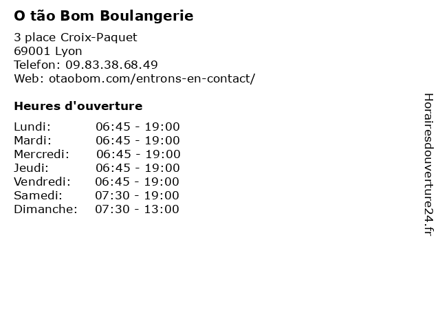 | 1 Boulangerie Pâtisserie Du Grand Lyon (Distance: 0,54 km) 29 Rue Bouteille, 69001 Lyon boulangerie, du, grand, lyon, pâtisserie 2 Boulangerie O Tão Bom (Distance: 0,61 km) 41 Avenue Maréchal Foch, 69006 Lyon biscuits, bom, boulangerie, chocolats, gâteaux, o tão, pâtisserie, tão 3 Boulangerie Caclin Philippe (Distance: 0,65 km) 13 rue d'Austerlitz, 69004 Lyon boulangerie, caclin, desserts, nourriture, pain, philippe 4 Boulangerie Saint Vincent (Distance: 0,66 km) 49 Quai Saint-Vincent, 69001 Lyon biscuits, boulangerie, chocolats, gâteaux, pâtisserie, saint, vincent 6 Boulangerie Les Frangins (Distance: 0,87 km) 38 Rue Ferrandière, 69002 Lyon boulangerie, frangins, les, pains, patisserie, viennoiserie |