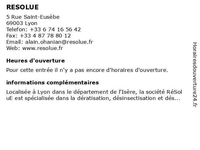 Localisée à Lyon dans le département de l'Isère, la société RéSoluE est spécialisée dans la dératisation, désinsectisation et désinfection des locaux publics ou privés. Pour de plus am...