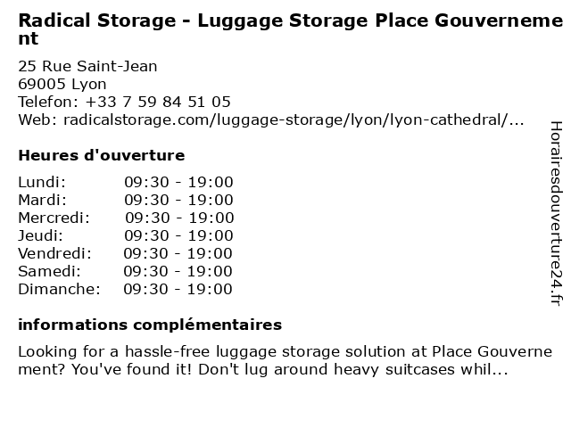 1 Nannybag Luggage Storage - Vieux Lyon (Distance: 0,03 km) 34 Rue Saint-jean, 69005 Lyon luggage, lyon, nannybag, storage, vieux 2 Luggage Storage Vieux Lyon - Radical Storage (Distance: 0,04 km) 28 Rue Saint-Jean, 69005 Lyon luggage, luggage storage, luggage storage near me, lyon, radical, storage, vieux 3 Le Petit Bouchon de la Place (Distance: 0,05 km) 4 Place Neuve Saint-Jean, 69005 Lyon apéritif, boissons, bouchon, de, la, le, petit, place, restaurant 4 Nannybag Luggage Storage (Distance: 0,06 km) 16 Quai Romain Rolland, 69005 Lyon luggage, nannybag, storage 5 Luggage Storage Saint-paul Station - Radical Storage (Distance: 0,30 km) 4 Place Saint-Paul, 69005 Lyon luggage, luggage storage, luggage storage near me, paul, radical, saint, station, storage 6 Nannybag Luggage Storage - CLOSED (Distance: 0,95 km) 24 Rue Sainte-hélène, 69002 Lyon closed, luggage, nannybag, storage |