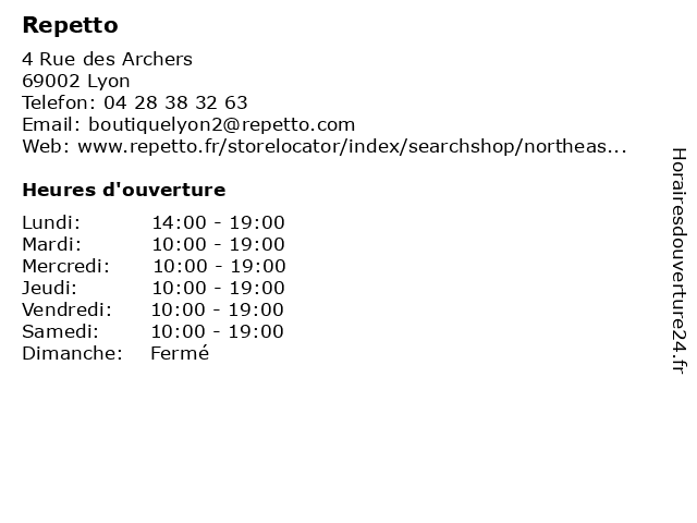 1 Repetto (Distance: 0,69 km) n/a Dieu, 69003 Lyon chaussures, garde-robe, maroquinerie, parfum, repetto 2 Repetto (Distance: 0,70 km) 36 rue du président Edouard Herriot, 69001 Lyon chaussures, garde-robe, maroquinerie, parfum, repetto 3 Repetto - PRINTEMPS (Distance: 0,27 km) 42 rue de la République, 69002 Lyon chaussures, garde-robe, maroquinerie, parfum, printemps, repetto 4 By Johanne (Distance: 0,02 km) 2 rue des archers, 69002 Lyon accessoires, bijoux, by, fantaisie, johanne, porter, pret 5 Coton Doux (Distance: 0,05 km) 14 Rue Emile Zola, 69002 Lyon accessoires, coton, doux, enfants, filles, garçons, habillement, mode, pret à porter, vêtements 6 Max Mara (Distance: 0,14 km) 85 Rue du Président Edouard Herriot, 69002 Lyon accessoires, habillement, mara, max, mode, pret a porter, vetements |