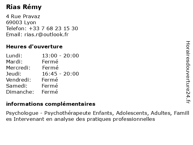 1 Maître Rémy Dandan - Avocat (Distance: 0,11 km) 21 Rue de Bonnel, 69003 Lyon avocat, avocats, cabinet, conseils, contentieux, dandan, juridique, justice, litiges, maître, rémy, services 2 Dr Rémy Rosset - Radiologue (Distance: 1,05 km) 76 Rue de Créqui, 69006 Lyon docteur, dr, médecin, radiologie, radiologue, rosset, rémy 3 Rémy Watrigant - Réalisateur Musicien (Distance: 1,53 km) - Place Jean Macé, 69007 Lyon musicien, musiques, réalisateur, rémy, vidéos, watrigant 4 Rémy Dubuc - Ostéopathe (Distance: 1,63 km) 31 Rue du Repos, 69007 Lyon dubuc, osteo, osteopathe, ostéopathe, rémy, sante, soins 5 Dr Rémy Vautrin - ORL - Chirurgien de la face et du cou (Distance: 1,86 km) 155 Boulevard de Stalingrad, 69006 Lyon chirurgien, cou, de, dr, du, et, face, la, laryngologie, orl, oto, rhino, rémy, vautrin 6 Dr Rémy Rosset - Radiologue (Distance: 1,86 km) 155 Boulevard de Stalingrad, 69006 Lyon docteur, dr, médecin, radiologie, radiologue, rosset, rémy |