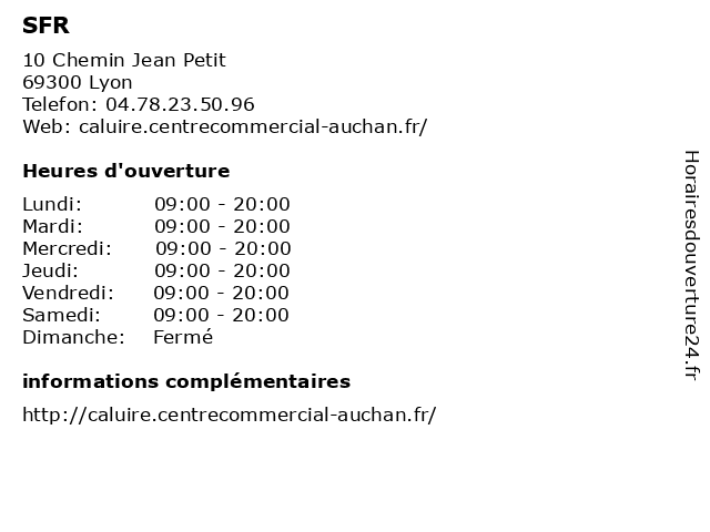 1 SFR (Distance: 0,95 km) 49 Rue Victor Hugo, 69002 Lyon abonnements de téléphonie mobile ou fixe fixe ou carte prépayée, accès internet haut débit ou la fibre optique ainsi que des abonnements à des bouquets de chaînes de télévision ., sfr, téléphones mobiles 2 SFR (Distance: 2,92 km) 17 rue du Docteur Bouchut, 69431 Lyon electronique et téléphonie, mode, sfr, shopping 3 SFR (Distance: 2,96 km) . Boulevard André Boulloche, 69800 Lyon accesories, beaute, cafe, enfants, homme, mode femme, restaurant, sfr 4 SFR (Distance: 3,20 km) 97 Rue Cuvier, 69006 Lyon abonnements de téléphonie mobile ou fixe fixe ou carte prépayée, accès internet haut débit ou la fibre optique ainsi que des abonnements à des bouquets de chaînes de télévision ., sfr, téléphones mobiles 5 SFR (Distance: 3,27 km) 71 avenue des Frères Lumière, 69008 Lyon abonnements de téléphonie mobile ou fixe fixe ou carte prépayée, accès internet haut débit ou la fibre optique ainsi que des abonnements à des bouquets de chaînes de télévision ., sfr, téléphones mobiles 6 SFR (Distance: 4,62 km) 81 Rue Roger Salengro, 69310 Pierre Benite abonnements de téléphonie mobile ou fixe fixe ou carte prépayée, accès internet haut débit ou la fibre optique ainsi que des abonnements à des bouquets de chaînes de télévision ., sfr, téléphones mobiles |