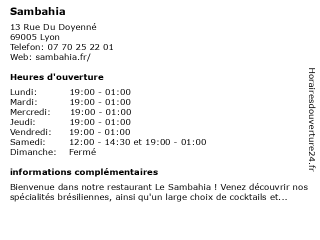 | Samedi | 12:00-14:30 et 19:00-01:00 |