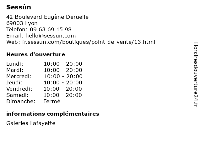 1 Sessùn (Distance: 1,70 km) 42 rue de la République, 69002 Lyon accesoires, boutiques, sessun, sessùn, vetements 2 Sessùn (Distance: 1,95 km) 18 rue Emile Zola, 69002 Lyon accesoires, boutiques, sessun, sessùn, vetements 3 Sessùn (Distance: 4,34 km) 209-221 boulevard Pinel, 69500 Bron accesoires, boutiques, sessun, sessùn, vetements 4 Lisette Pizzi (Distance: 1,77 km) 38 passage de l'Argue, 69002 Lyon accesoires, bagages, lisette, maroquinerie, pizzi, sacs 5 Liu Jo (Distance: 1,83 km) 9 Rue des Archers, 69002 Lyon accesoires, boutique, jo, liu, mode, vetements 6 Les Petites Bombes By Mélanie (Distance: 26,49 km) 6 Rue clémentine, 38200 Vienne accesoires, bombes, by, femme, jeans, les, lpb, melanie, mélanie, pantalons, petites, tendances, vestes, vetements |