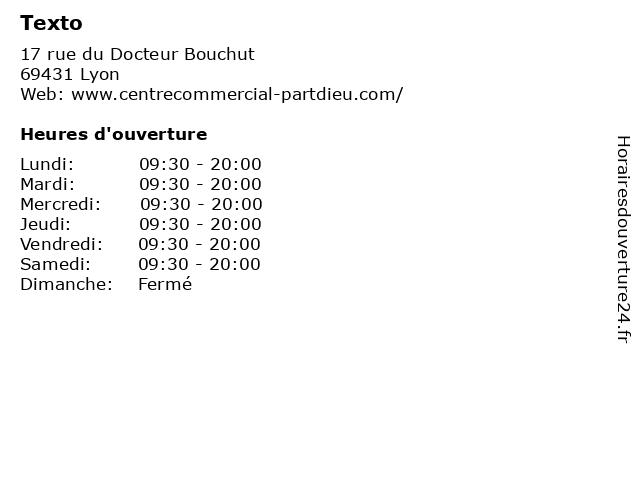 | Samedi | 09:30-20:00 |