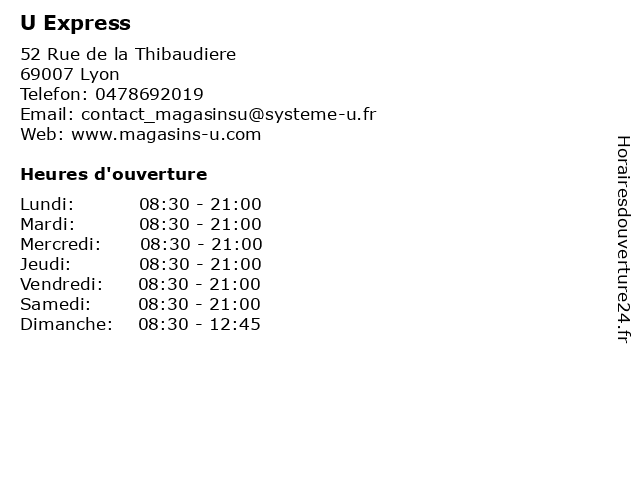 4 U Express (Distance: 2,12 km) 251 Cours Lafayette, 69006 Lyon express, magasin, nourriture, supermarché 6 U Express (Distance: 4,13 km) 305 Cours Emile Zola, 69100 Villeurbanne express, magasin, nourriture, supermarché |