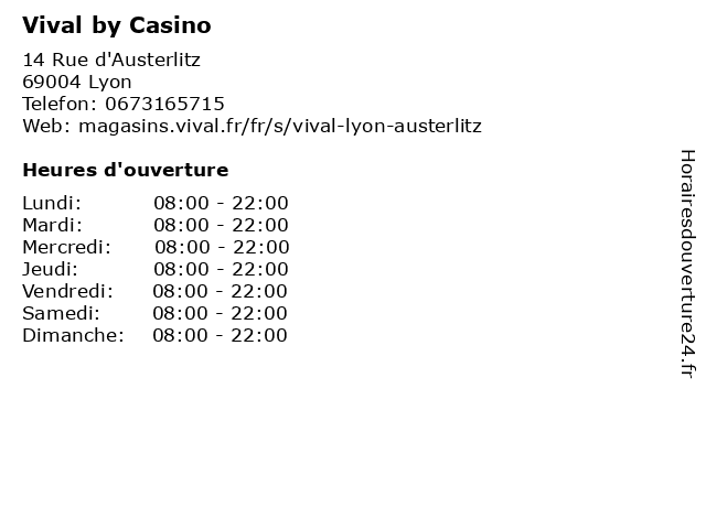 1 Vival by Casino (Distance: 1,88 km) 17 Quai Clemenceau, 69300 Caluire et Cuire by, casino, droguerie, d’hypermarchés, frais, fruits et légumes, hygiène, parfumerie et autres produits non alimentaires., surgelés, vival, épicerie 2 Vival by Casino (Distance: 3,17 km) 61 rue Chevreuil, 69007 Lyon by, casino, droguerie, d’hypermarchés, frais, fruits et légumes, hygiène, parfumerie et autres produits non alimentaires., surgelés, vival, épicerie 3 Vival by Casino (Distance: 3,32 km) 32 Avenue Berthelot, 69007 Lyon alimentation, by, casino, supermarché, vival 4 Vival by Casino (Distance: 3,44 km) 3 Place de la Ferrandière, 69003 Lyon alimentation, by, casino, supermarché, vival 5 Vival by Casino (Distance: 5,10 km) 345 Cours Emile Zola, 69100 Villeurbanne by, casino, droguerie, d’hypermarchés, frais, fruits et légumes, hygiène, parfumerie et autres produits non alimentaires., surgelés, vival, épicerie 6 Vival by Casino (Distance: 5,48 km) 78 Boulevard des États-Unis, 69008 Lyon by, casino, droguerie, d’hypermarchés, frais, fruits et légumes, hygiène, parfumerie et autres produits non alimentaires., surgelés, vival, épicerie |