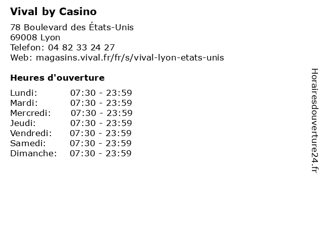 1 Vival by Casino (Distance: 0,39 km) 143 Rue Professeur Beauvisage, 69008 Lyon alimentation, by, casino, supermarché, vival 2 Vival by Casino (Distance: 2,57 km) 61 rue Chevreuil, 69007 Lyon by, casino, droguerie, d’hypermarchés, frais, fruits et légumes, hygiène, parfumerie et autres produits non alimentaires., surgelés, vival, épicerie 3 Vival by Casino (Distance: 2,65 km) 32 Avenue Berthelot, 69007 Lyon alimentation, by, casino, supermarché, vival 4 Vival by Casino (Distance: 3,02 km) 38 Avenue Georges Pompidou, 69003 Lyon by, casino, droguerie, d’hypermarchés, frais, fruits et légumes, hygiène, parfumerie et autres produits non alimentaires., surgelés, vival, épicerie 5 Vival by Casino (Distance: 3,11 km) 3 Place de la Ferrandière, 69003 Lyon alimentation, by, casino, supermarché, vival 6 Vival by Casino (Distance: 3,81 km) 208 Avenue Franklin Roosevelt, 69500 Bron by, casino, droguerie, d’hypermarchés, frais, fruits et légumes, hygiène, parfumerie et autres produits non alimentaires., surgelés, vival, épicerie |