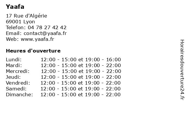 | Dimanche | 12:00-15:00 et 19:00-22:00 |