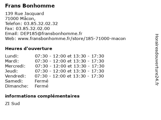 1 Frans bonhomme (Distance: 29,45 km) 161 Rue de La Chatonnière, 69400 Arnas bonhomme, chauffage, frans, magasins, plomberie, services 2 Frans Bonhomme (Distance: 32,45 km) 6ter Rue Barthélémy Thimonnier Cenord, 01000 Bourg-en-Bresse bonhomme, chauffage, frans, magasins, plomberie, services 4 Dr Jocelyne Lassus Bonhomme - Médecin Généraliste (Distance: 35,10 km) 77 rue Pierre Duverger, 01330 Villars-les-Dombes bonhomme, docteur, dr, générale, généraliste, jocelyne, lassus, médecin, médecine, santé, secrétariat, soin, thérapie 5 Frans Bonhomme (Distance: 50,63 km) 75 Route De Dijon, 71500 Branges bonhomme, chauffage, frans, magasins, plomberie, services 6 Frans Bonhomme (Distance: 51,59 km) - rue Charles de Gaulle, 01500 Château-Gaillard bonhomme, bricolage, equipement, frans, materiaux, materiel, robinetterie, travaux  |