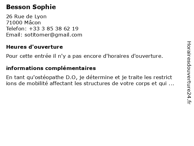 1 Marie-Sophie Georges - Ostéopathe (Distance: 0,54 km) 8 Place de la Barre, 71000 Mâcon georges, marie, osteo, osteopathe, ostéopathe, sante, soins, sophie 2 Anne-Sophie Boisson Siraudin - Ostéopathe (Distance: 1,46 km) 106 Place Mommessin,, 71850 Charnay-lès-Mâcon anne, boisson, ostéo, ostéopathe, ostéopathes, siraudin, soins, sophie 3 Dr Sophie Barbe-Richaud - Anesthésiste (Distance: 1,85 km) 350 Boulevard Louis Escande, 71000 Macon anesthésiste, barbe, consultation, docteur, dr, med, médecin, richaud, sophie, traitement 4 Dr Sophie Malhiere - Anesthésiste (Distance: 1,85 km) 350 Boulevard Louis Escande, 71000 Macon anesthésiste, consultation, docteur, dr, malhiere, med, médecin, sophie, traitement 5 Besson Chaussures (Distance: 2,16 km) . Route de Lyon, 71000 Macon besson, chaussures, enfants, homme, mode femme 6 Dr Sophie Roy - Médecin nucléaire - secrétariat (Distance: 2,20 km) 40 Rue Ambroise Pare, 71000 Mâcon dr, médecin, médecins, médicaments, nucléaire, roy, santé, secrétariat, sophie, spécialiste |