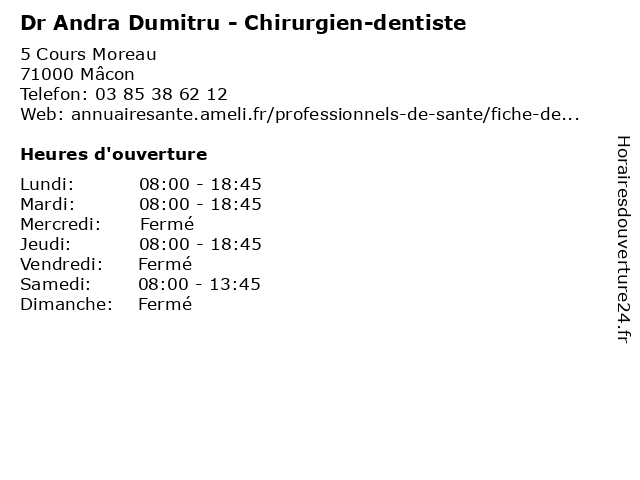 1 Dr Andra Dumitru - Chirurgien-dentiste (Distance: 0,00 km) 5 Cours de l'Évêque Moreau, 71000 Mâcon andra, chirurgien, dent, dentiste, docteur, dr, dumitru, soins 2 Dr Georgiana Carmina Dumitru - Psychiatre (Distance: 46,28 km) 55 Rue Auguste Champion, 71100 Sevrey carmina, consultation, docteur, dr, dumitru, georgiana, med, medecine, medical, médecin, psychiatre, traitement 3 Medecin Emmanuel Odet - Horaires du Cabinet (Chirurgien viscéral) (Distance: 1,68 km) . Boulevard Louis Escande, 71000 Macon cabinet, chirurgien, docteur, du, emmanuel, horaires, medecin, odet, sante, services, viscéral 4 Medecin Bruno Stefani (Chirurgien général) (Distance: 33,11 km) . Route de Jasseron, 01000 Bourg-en-Bresse bruno, chirurgien, docteur, général, medecin, sante, services, stefani 5 Medecin Loic Fabre Aubrespy (Chirurgien orthopédiste et traumatologue) (Distance: 53,15 km) 4B Allee Saint Jean des Vignes, 71100 Chalon-sur-Sâone aubrespy, chirurgien, docteur, et, fabre, loic, medecin, orthopédiste, sante, services, traumatologue 6 Dr. Janier Chirurgien-Dentiste (Distance: 57,34 km) 1 Rue Louis Juttet,, 69410 Champagne Au Mont d'Or, chirurgien, consultation, dentiste, docteur, dr., janier, santé |