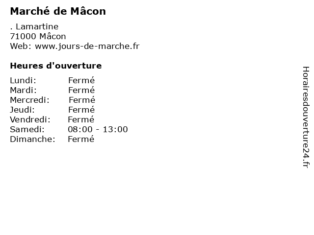 1 Marché de Mâcon (Distance: 2,42 km) . Place du Commerce, 71000 Mâcon alimentaire, de, fleur, habillement, marché, mâcon, services 2 Marché de Mâcon (Distance: 6,47 km) . Place Gardon, 71000 Mâcon alimentaire, de, fleur, habillement, marché, mâcon, services 3 Marché à Vire (Distance: 3,86 km) . Place du Château, 14500 Vire frutas, hortalizas, marché, mercado, verduras, vire 4 Marché à Marigny (Distance: 8,02 km) . Ville, 50570 Marigny frutas, hortalizas, marché, marigny, mercado, verduras 5 Marché à La Rochette (Distance: 11,01 km) . Ville, 73110 La Rochette frutas, hortalizas, la, marché, mercado, rochette, verduras 6 Marché Aux Affaires (Distance: 11,58 km) 690 route de Bourg, 38440 Saint Jean accessories, affaires, aux, basketry, christmas, cosmetics, household, hygiene, marché, paintings, stationary, toys, wool |