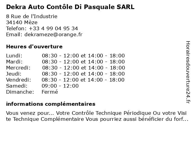 1 Centre contrôle technique DEKRA (Distance: 0,00 km) 8 Rue de l'Industrie, 34140 Mèze 4x4, camping car, centre, collection, contrôle, dekra, diesel, electrique, essence, gazole, suv, technique, utilitaire, voiture 2 Dekra (Distance: 6,20 km) 130 Chemin De La Catonniere, 34540 Balaruc Le Vieux automobile, dekra, services, technique 3 Norisko Auto Contrôle Di Pasquale (Distance: 8,81 km) 30 Impasse des Lauriers, 34560 Poussan auto, contrôle, di, norisko, pasquale 4 Dekra (Distance: 9,30 km) . Route De Sète, 34540 Balaruc-Les-Bains automobile, dekra, services, technique 5 Nathalie Di Pirro - Sophrologue (Distance: 9,92 km) 4 rue des Sophoras, 34540 Balaruc-les-Bains di, nathalie, pirro, sante, soins, sophrologie, sophrologue 6 Centre d’examen du code de la route - DEKRA (Distance: 10,15 km) 9 rue Jules Valles, 34200 SETE centre, code, cours, de, dekra, du, d’examen, examens, formation, la, permis, route |