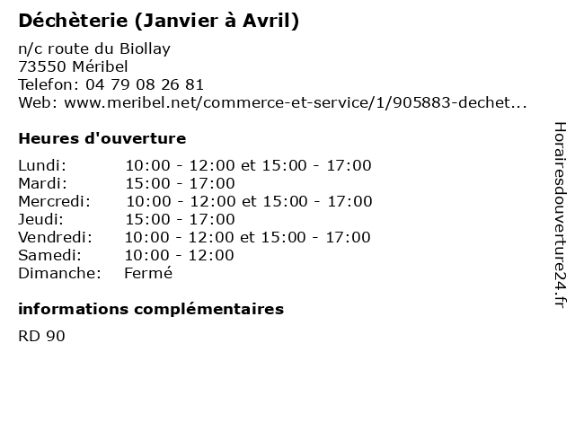 1 Déchèterie (Mai à Décembre) (Distance: 0,00 km) n/c route du Biollay, 73550 Méribel débarras, décembre, déchets, déchèterie, mai, poubelles 2 Déchèterie (Distance: 4,62 km) - Courchevel, 73120 Saint-Bon-Tarentaise déchèterie, gravats, huiles usées, la réception des déchets et écocentres, les appareils électroménagers, les déchets verts, papier et carton en quantité 3 Déchèterie (Hiver) (Distance: 7,83 km) - L’Ile Ferlay, 73600 Les Belleville de, décembre, déchèterie, gravats, hiver, huiles usées, la réception des déchets et écocentres, les appareils électroménagers, les déchets verts, mars, papier et carton en quantité, villarlurin 4 Déchèterie de Villarlurin (Eté) (Distance: 7,83 km) - L'Ile Ferlay, 73600 Les Belleville avril, de, débarras, déchets, déchèterie, eté, novembre, poubelles, villarlurin 5 Déchèterie (Distance: 9,35 km) - Les Menuires, 73440 Saint-Martin-de-Belleville déchèterie, gravats, huiles usées, la réception des déchets et écocentres, les appareils électroménagers, les déchets verts, papier et carton en quantité 6 Richardson (1er janvier au 31 aout) (Distance: 10,21 km) 110 Avenue de la Gare, 73600 Moutiers 1er, 31, aménagement, aout, au, equipement, janvier, mobilier, richardson |