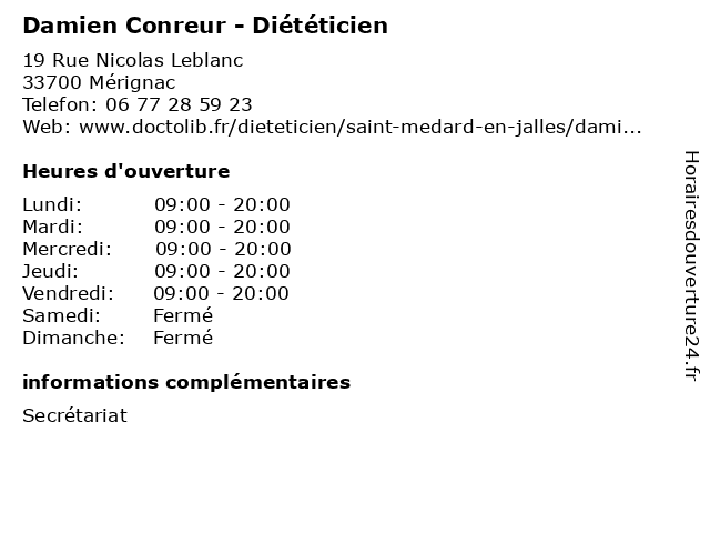 1 Marion Bachelard - Diététicien - secrétariat (Distance: 2,63 km) 1 Avenue Gabriel Péri, 33700 Mérignac bachelard, cabinet, diététicien, diététique, marion, medical, secrétariat 2 Laurence Martinaud - Diététicien - secrétariat (Distance: 4,83 km) 385 Avenue de l'Argonne, 33700 Mérignac cabinet, diététicien, diététique, laurence, martinaud, medical, secrétariat 3 Laurence Martinaud - Diététicien - secrétariat (Distance: 6,72 km) 5 Bis Avenue de Verdun, 33610 Cestas cabinet, diététicien, diététique, laurence, martinaud, medical, secrétariat 4 Anna Coustal - Diététicien - secrétariat (Distance: 6,78 km) 71 Rue de Lyon, 33000 Bordeaux anna, cabinet, coustal, diététicien, diététique, medical, secrétariat 5 Damien Pichon - Masseur-kinésithérapeute (Distance: 6,90 km) 55 Avenue de Soulac, 33320 Le Taillan-Médoc damien, docteur, kine, kinesitherapeute, kinésithérapeute, masseur, pichon 6 Margaux Tiberghien - Diététicien - secrétariat (Distance: 8,24 km) 239 Boulevard Godard, 33110 Le Bouscat cabinet, diététicien, diététique, margaux, medical, secrétariat, tiberghien |