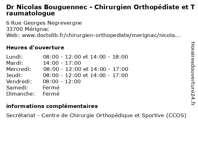 1 Dr Nicolas Bouguennec - Chirurgien orthopédiste et traumatologue (Distance: 0,20 km) 2 Rue Georges Negrevergne, 33700 Mérignac bouguennec, chirurgien, consultation, docteur, dr, et, med, médecin, médecine, nicolas, orthopédiste, secrétariat, traitement, traumatologue 2 Dr Christian Peyraud - Chirurgien orthopédiste et traumatologue (Distance: 0,00 km) 6 Rue Georges Negrevergne, 33700 Mérignac chirurgie, chirurgien, christian, dr, et, general, orthopédiste, peyraud, soins, traumatologue 3 Dr Amélie Leglise - Chirurgien orthopédiste et traumatologue (Distance: 0,00 km) 6 Rue Georges Negrevergne, 33700 Mérignac amélie, chirurgie, chirurgien, dr, et, general, leglise, orthopédiste, soins, traumatologue 4 Dr Antoine Morvan - Chirurgien orthopédiste et traumatologue (Distance: 0,00 km) 6 Rue Georges Negrevergne, 33700 Mérignac antoine, chirurgien, dr, et, morvan, orthopedie, orthopédique, orthopédiste, trauma, traumatologie, traumatologique, traumatologue 5 Dr Christophe de Lavigne - Chirurgien Orthopédiste et Traumatologue (Distance: 0,00 km) 6 Rue Georges Negrevergne, 33700 Mérignac 33700, arthrose, bordeaux, centre, chirurgien, christophe, de, dr, et, lavigne, mérignac, orthopédiste, traumatologue 6 Dr Guillaume Cordier - Chirurgien Orthopédiste et Traumatologue (Distance: 0,00 km) 6 Rue Georges Negrevergne, 33700 Mérignac 33700, arthrose, bordeaux, centre, chirurgien, cordier, dr, et, guillaume, mérignac, orthopédiste, traumatologue |