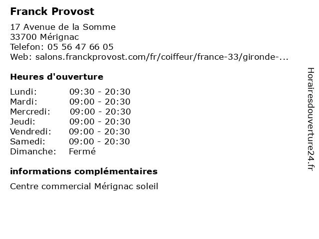 1 Franck Provost (Distance: 1,67 km) 470 avenue de Verdun, 33700 Merignac expertise beauté, franck, la marque, provost, tendance coiffure, événement 2 Franck Provost (Distance: 5,02 km) - Avenue de la Tuileranne, 33600 Pessac coiffeur, coiffure, franck, provost, salon 3 Franck Provost (Distance: 5,61 km) 118 Cours du Général de Gaulle, 33170 Gradignan beauté, coiffeur, franck, provost, services 4 Franck Provost (Distance: 5,92 km) 57 Rue du Château d'Eau, 33000 Bordeaux beauté, cheveux, coiffure, franck, provost, salon, service 5 Franck Provost (Distance: 6,04 km) 17 Place Gambetta, 33110 Le Bouscat beauté, cheveux, coiffure, franck, provost, salon, service 6 Franck Provost (Distance: 6,62 km) 25 Rue Sainte-Catherine, 33000 Bordeaux beauté, cheveux, coiffure, franck, provost, salon, service |