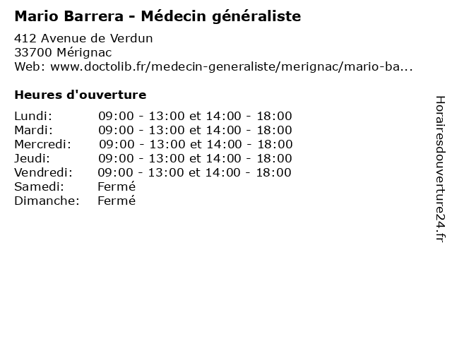 1 Mario Barrera - Médecin généraliste (Distance: 3,59 km) 8 Rue Pierre Georges Latécoère, 33700 Mérignac barrera, docteur, generaliste, généraliste, mario, medecin, médecin, soins 2 Chez Mario (Distance: 3,87 km) 10 ter avenue Jean Jaurès, 33600 Pessac chez, italien, livraisons, mario, pizza, pizzas, pizzeria, restaurant, restauration, sur place, à emporter 3 Mario's Pizza (Distance: 4,08 km) 155 rue croix de Seguey, 33000 Bordeaux fast, food, mario's, pizza, pizzeria, rapide, restaurant, restauration 4 Mario E Lillo Caffe (Distance: 4,34 km) 63 Boulevard George v, 33000 Bordeaux bar, bistro, bistrot, brasserie, caffe, café, lillo, mario, restaurant, restauration 5 Mario Dessuti (Distance: 5,03 km) 13 rue Michel Montaigne, 33000 Bordeaux boutique, dessuti, magasins, mario, smoking, vetements 6 De Santi Giovanni Mario (Distance: 8,65 km) 70 Chemin Lafitte, 33300 Bordeaux giovanni, mario, restaurants, santi |