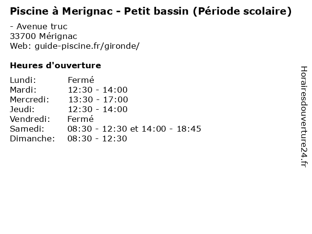 1 Piscine à Merignac - Petit bassin (Vacances scolaires (hors vacances d'été)) (Distance: 0,00 km) - Avenue truc, 33700 Mérignac bassin, d'été, hors, merignac, natation sportive, petit, piscine, scolaires, sportif, vacances 2 Piscine à Merignac - Petit bassin (Vacances d'été ) (Distance: 0,00 km) - Avenue truc, 33700 Mérignac bassin, d'été, merignac, natation sportive, petit, piscine, sportif, vacances 3 Piscine à Merignac - Grand Bassin (Période scolaire) (Distance: 0,00 km) - Avenue truc, 33700 Mérignac bassin, grand, merignac, natation sportive, piscine, période, scolaire, sportif 4 Piscine à Merignac - Grand Bassin (Vacances scolaires (hors vacances d'été)) (Distance: 0,00 km) - Avenue truc, 33700 Mérignac bassin, d'été, grand, hors, merignac, natation sportive, piscine, scolaires, sportif, vacances 5 Piscine à Merignac - Grand Bassin (Vacances d'été) (Distance: 0,00 km) - Avenue truc, 33700 Mérignac bassin, d'été, grand, merignac, natation sportive, piscine, sportif, vacances 6 |