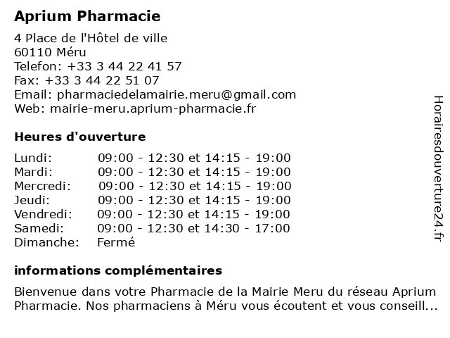 2 Aprium Pharmacie Cité Santé (Distance: 25,02 km) 248 Rue de l'Ambassadeur, 95610 Éragny aprium, cité, eragny, pharmacie, santé, test antigénique 3 Aprium Pharmacie de l'Europe (Distance: 25,48 km) 101 Avenue de l'Europe, 60180 Nogent-sur-Oise aprium, de, l'europe, pharmacie 4 Aprium Pharmacie (Distance: 25,60 km) 4 Avenue du Général de Gaulle, 95250 Beauchamp aprium, pharmacie 5 Aprium Pharmacie Du Marche (Distance: 26,45 km) 6 Rue de Vienne, 27140 Gisors aprium, aromathérapie, beauté, compléments alimentaires, covid-19, depistage, du, homéopathie, hygiène orale, marche, matériel médical, médicaments, orthopédie, parapharmacie, pharmacie, pharmacie bio, produits vétérinaires, tests antigéniques, tests serologiques, vaccination, équipements médicaux 6 |