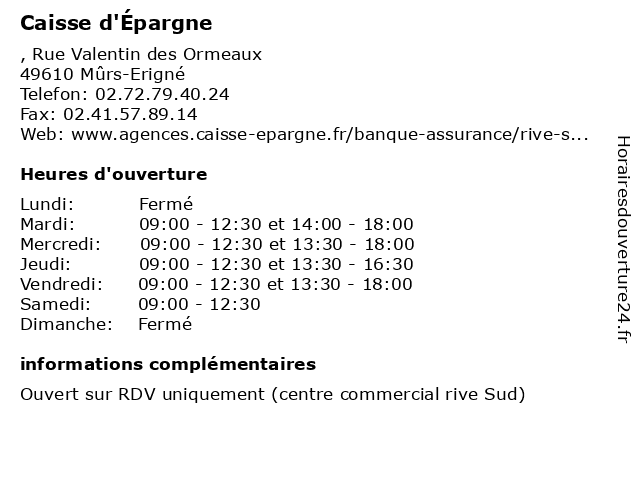 1 Caisse d'Épargne (Distance: 3,91 km) 25 Rue David d'Angers, 49130 Les Ponts-de-Cé banque, caisse, carte, d'epargne, d'épargne, services 2 Caisse d'Épargne (Distance: 6,85 km) , Place Jean XXIII,, 49000 Angers banque, caisse, carte, d'epargne, d'épargne, services 3 Caisse d'Épargne (Distance: 8,03 km) 6 Route de Beaufort, 49124 Saint-Barthélemy-d'Anjou banque, caisse, carte, d'epargne, d'épargne, services 4 Caisse d'Épargne (Distance: 10,37 km) 2, Avenue de la Fontaine, 49070 Beaucouzé banque, caisse, carte, d'epargne, d'épargne, services 5 Caisse d'Épargne (Distance: 14,05 km) 16 Rue Emmanuel Voisin, 49480 Saint-Sylvain-d'Anjou banque, caisse, carte, d'epargne, d'épargne, services 6 Caisse d'Épargne (Distance: 18,51 km) 27 Place de l'Hôtel de Ville, 49290 Chalonnes Sur Loire banque, caisse, carte, d'epargne, d'épargne, services |