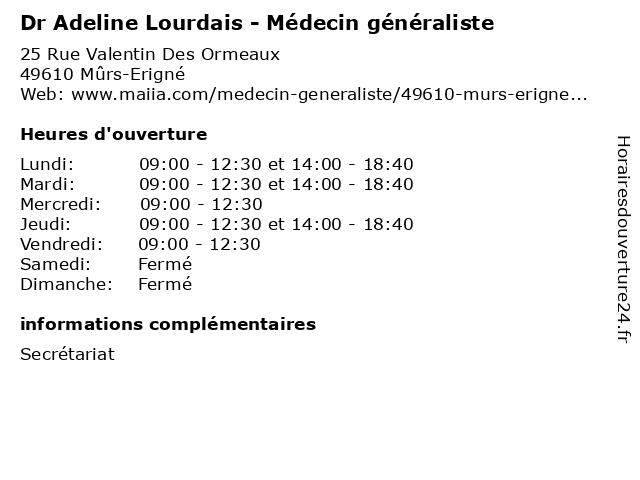 1 Dr Adeline Martineau - Médecin généraliste (Distance: 0,00 km) 25 Rue Valentin des Ormeaux, 49610 Mûrs-Erigné adeline, docteur, dr, generaliste, généraliste, martineau, medical, médecin, soin 2 Dr Adeline Berthel - Pédiatre (Distance: 6,71 km) 6 Rue de Bellinière, 49800 Trélazé adeline, berthel, dr, enfant, pediatre, pédiatre, sante, soins 3 AXA ANSELME DE BULOIS - ADELINE MOTHAIS ADBM ASSURANCES (Distance: 7,04 km) 131 Rue de la Madeleine, 49000 Angers adbm, adeline, anselme, assurances, axa, bulois, de, mothais 4 GUIGNARD ADELINE (Distance: 10,66 km) 1 Rue De La Gagnerie, 49750 Beaulieu sur Layon adeline, guignard 5 Dr Adeline Richer - Médecin généraliste (Distance: 23,21 km) 7 Square des Marais, 49350 Gennes-Val-de-Loire adeline, docteur, dr, generaliste, généraliste, medical, médecin, richer, soin 6 Dr Adeline Bodet Richer - Médecin généraliste (Distance: 23,21 km) 7 Square des Maraise, 49350 Gennes-Val-de-Loire adeline, bodet, consultation, docteur, dr, dr., générale, généraliste, medecins, médecin, médecine, rendez, richer, santé, sur, vous |