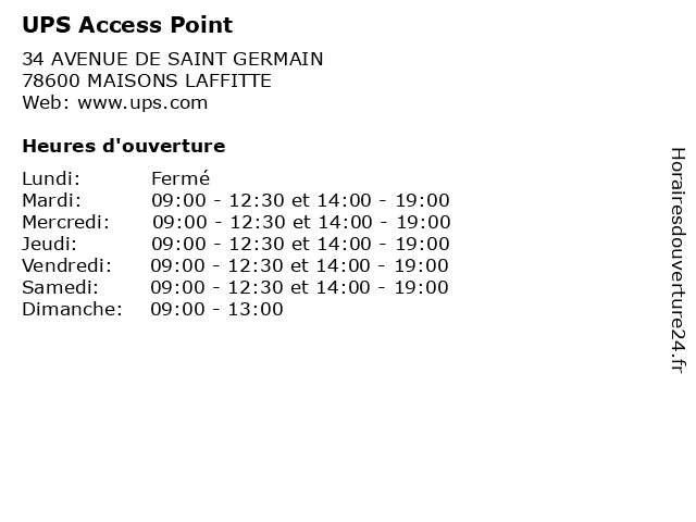 1 UPS Access Point (Distance: 0,59 km) 12 RUE DES PLANTES, 78600 MAISONS LAFFITTE access, commerce international, expédition internationale, fret, packaging supplies, petites entreprises, point, ups 2 UPS Access Point (Distance: 0,89 km) 107 AVENUE DE POISSY, 78600 LE MESNIL LE ROI access, commerce international, expédition internationale, fret, packaging supplies, petites entreprises, point, ups 3 UPS Access Point (Distance: 4,85 km) 90 ROUTE DE MAISONS, 78400 CHATOU access, commerce international, expédition internationale, fret, packaging supplies, petites entreprises, point, ups 4 UPS Access Point (Distance: 7,36 km) 75 AVENUE ARISTIDE BRIAND, 78700 CONFLANS STE HONORINE access, commerce international, expédition internationale, fret, packaging supplies, petites entreprises, point, ups 5 UPS Access Point (Distance: 9,56 km) 95 RUE GENERAL LECLERC, 92270 BOIS COLOMBES access, commerce international, expédition internationale, fret, packaging supplies, petites entreprises, point, ups 6 UPS Access Point (Distance: 10,14 km) 1 RUE DU BAS NOYER, 95610 ERAGNY access, commerce international, expédition internationale, fret, packaging supplies, petites entreprises, point, ups |