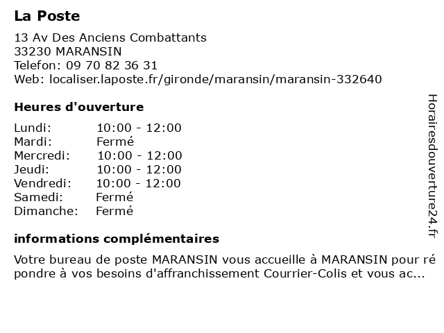 1 La Poste (Distance: 2,35 km) 25 Ter Avenue de Verdun, 33620 Lapouyade agence, assurance, banque, banque postale, bureau de poste, chronopost, colis, courrier, dps, expéditions internationales, la, point, postale, poste, relais, timbres, téléphonie, ups, western union 2 La Poste (Distance: 4,32 km) - le Bourg, 80330 Saint-Ciers-d'Abzac agence, assurance, banque, banque postale, bureau de poste, chronopost, colis, courrier, dps, expéditions internationales, la, point, postale, poste, relais, timbres, téléphonie, ups, western union 3 La Poste (Distance: 5,48 km) 10 Le Bourg, 33620 Marcenais agence, assurance, banque, banque postale, bureau de poste, chronopost, colis, courrier, dps, expéditions internationales, la, point, postale, poste, relais, timbres, téléphonie, ups, western union 4 La Poste (Distance: 7,38 km) 13 Avenue des Anciens Combattans, 33230 Marasin agence, banque, bureau, la, poste 6 La Poste (Distance: 10,35 km) 94 avenue de la République, 33240 Salignac agence, assurance, banque, banque postale, bureau de poste, chronopost, colis, courrier, dps, expéditions internationales, la, point, postale, poste, relais, timbres, téléphonie, ups, western union |